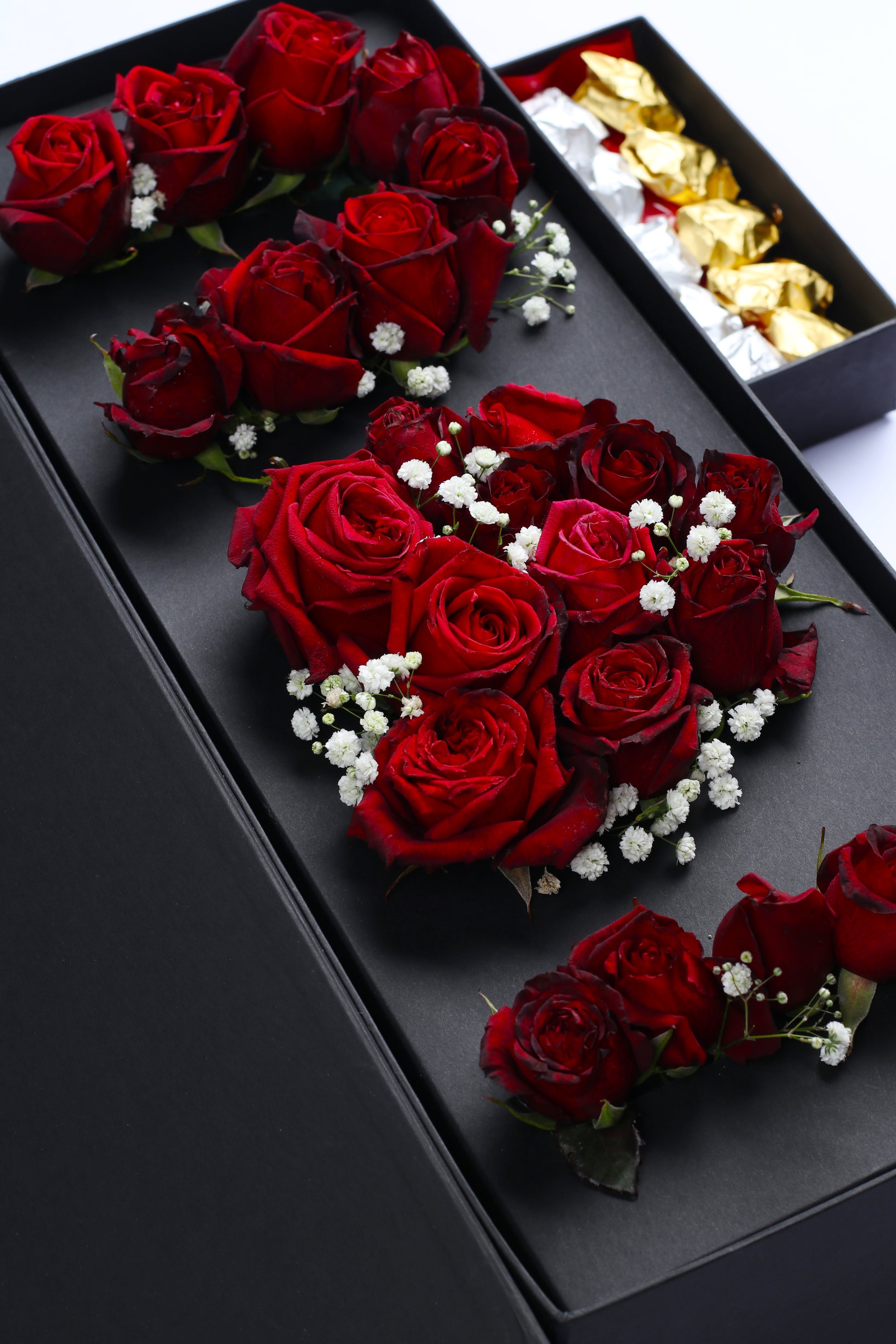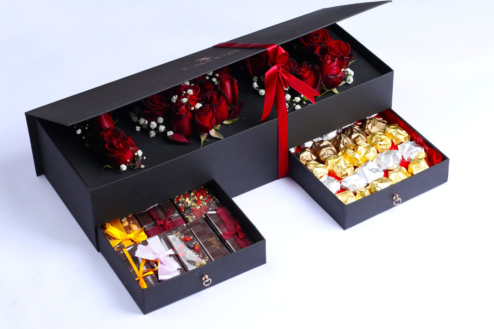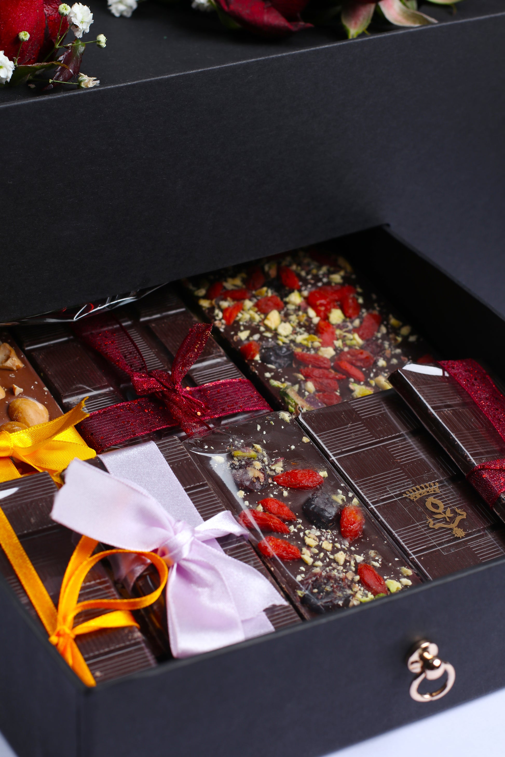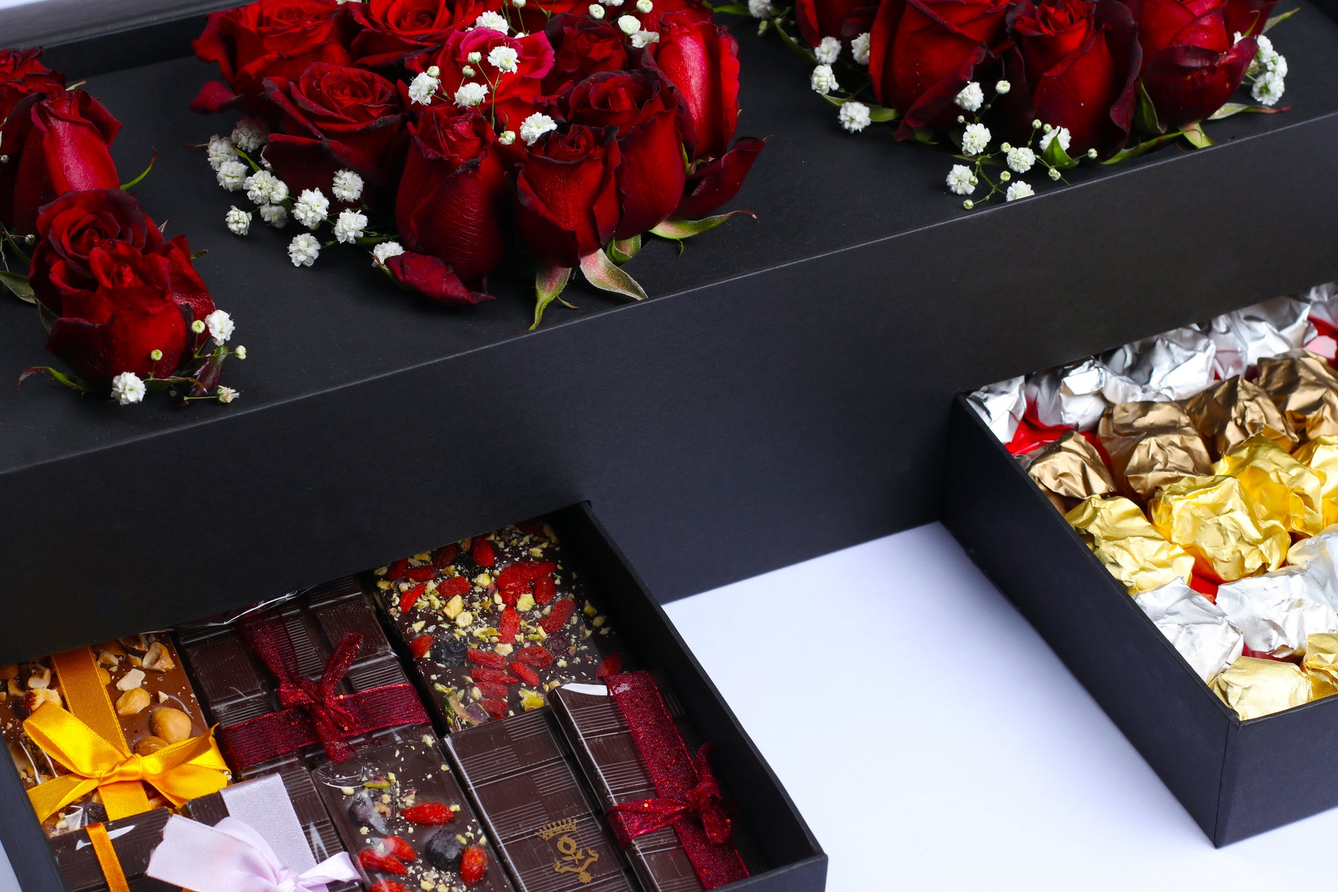 Roses and flowers, 50 pcs of mixed (dark and milk) chocolate with nuts + 3 chocolate bars 130 g . (1 dark chocolate nature, 1 dark chocolate with red fruits, 1 milk chocolate with nuts) + 5 chocolate bars 30 g. ( mixed between dark chocolate nature bars, milk chocolate with nuts bars and dark chocolate with red fruits bars) .